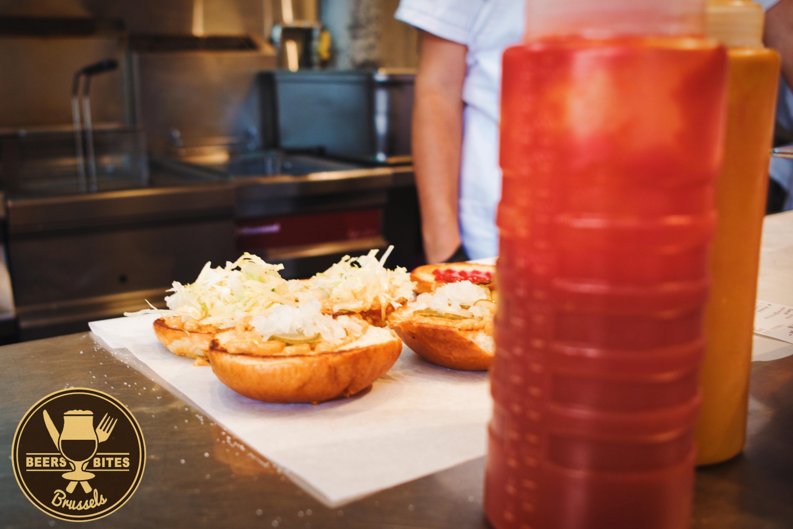 Supposedly, Rambo was even the first place in Belgium to serve up smash burgers, but definitely no longer the only one. It is an easy dish to copy, of course: just flatten a ball of ground beef on a hot griddle, and get that Maillard reaction going. None of that Belgian raw-on-the-inside nonsense, just crispy crust all the way!